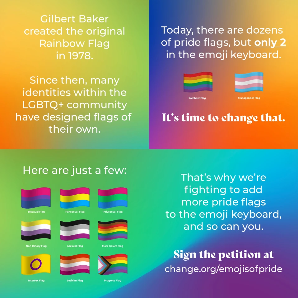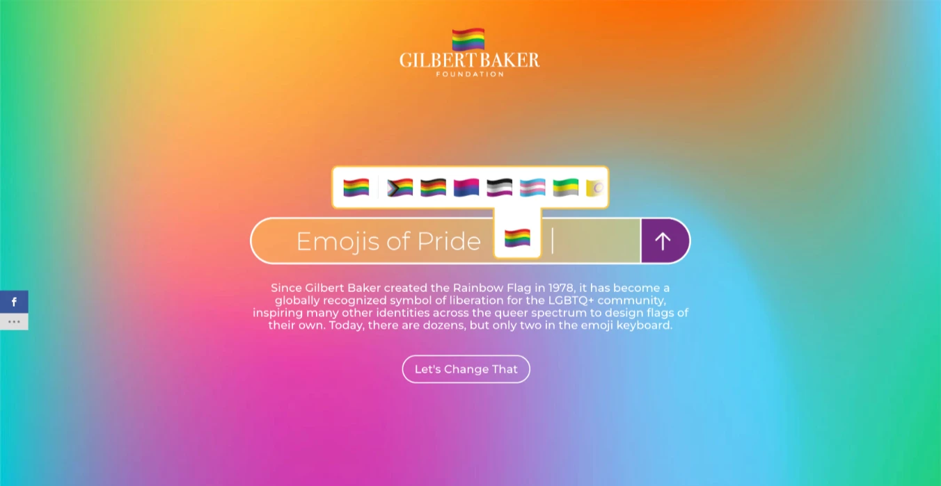 Emojis of Pride was a Pride 2021 campaign for the Gilbert Baker Foundation sparked by a simple reality: since the Rainbow Flag was created in 1978, dozens of queer identities have claimed their own flags, yet the emoji keyboard still only offers two Pride symbols.